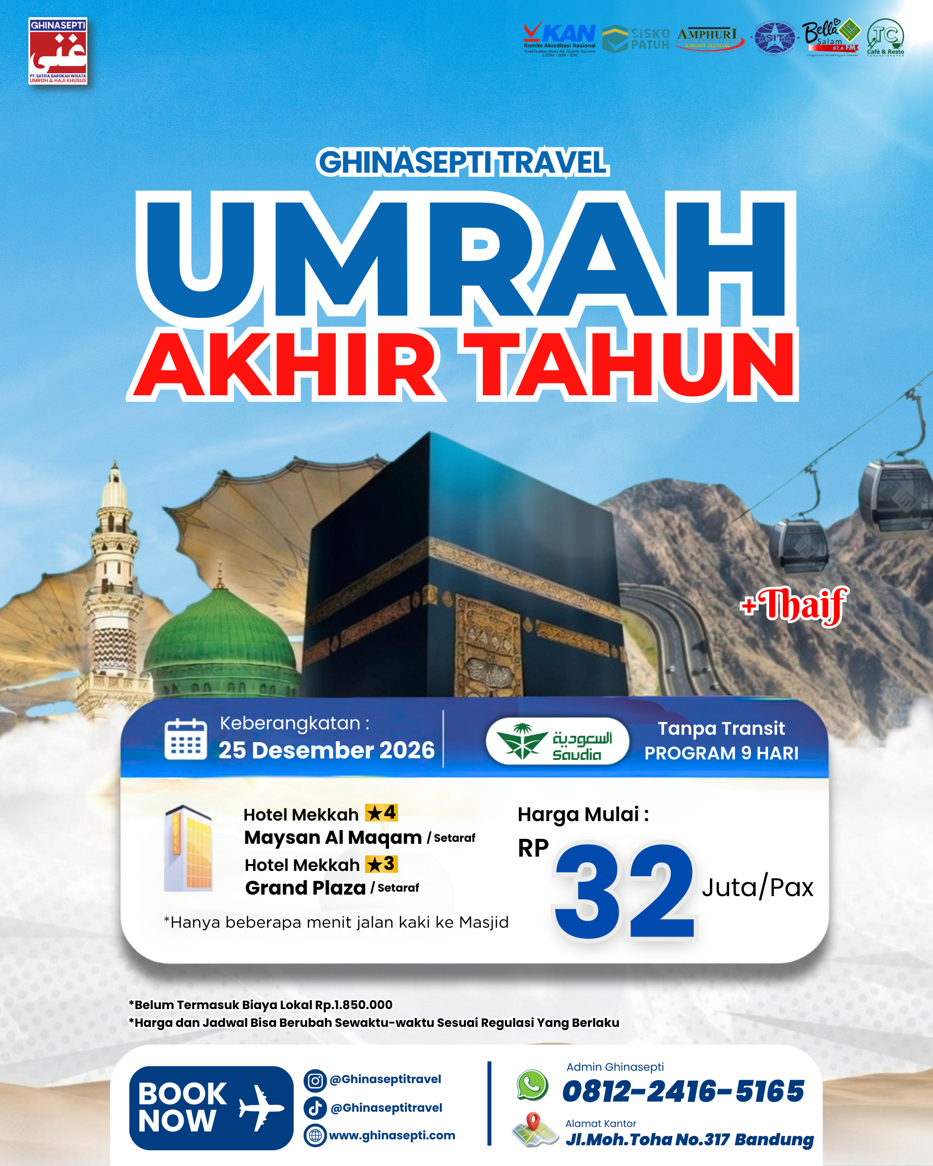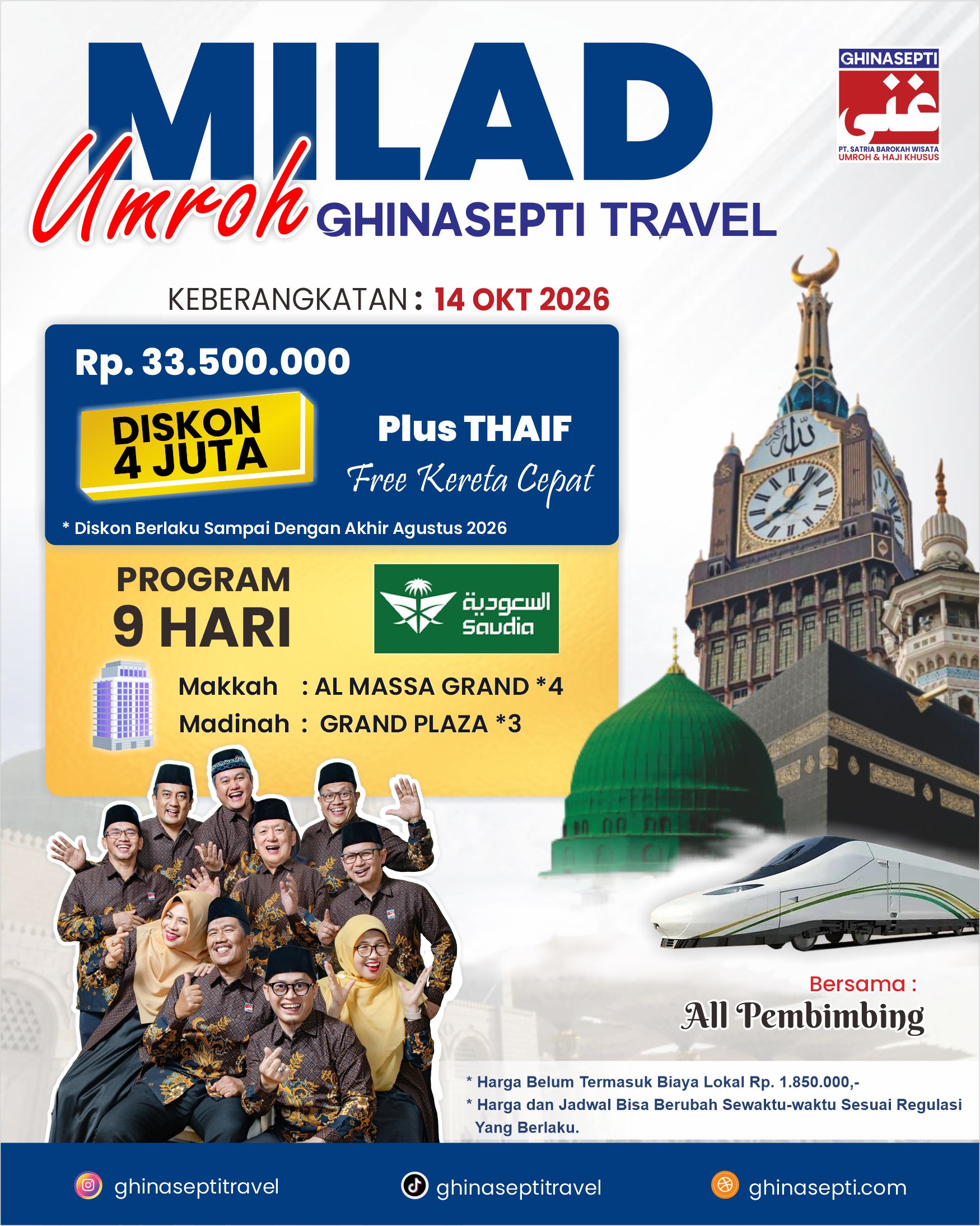 Ghinasepti Tours & Travel (PT. Satria Barokah Wisata) adalah Perusahaan Biro Perjalanan Wisata yang dirintis sejak Tahun 2010. Menjadi Penyelenggara Ibadah Umroh dan Haji Khusus yang Santun, Edukatif, Profesional, Terpercaya dan Inovatif.